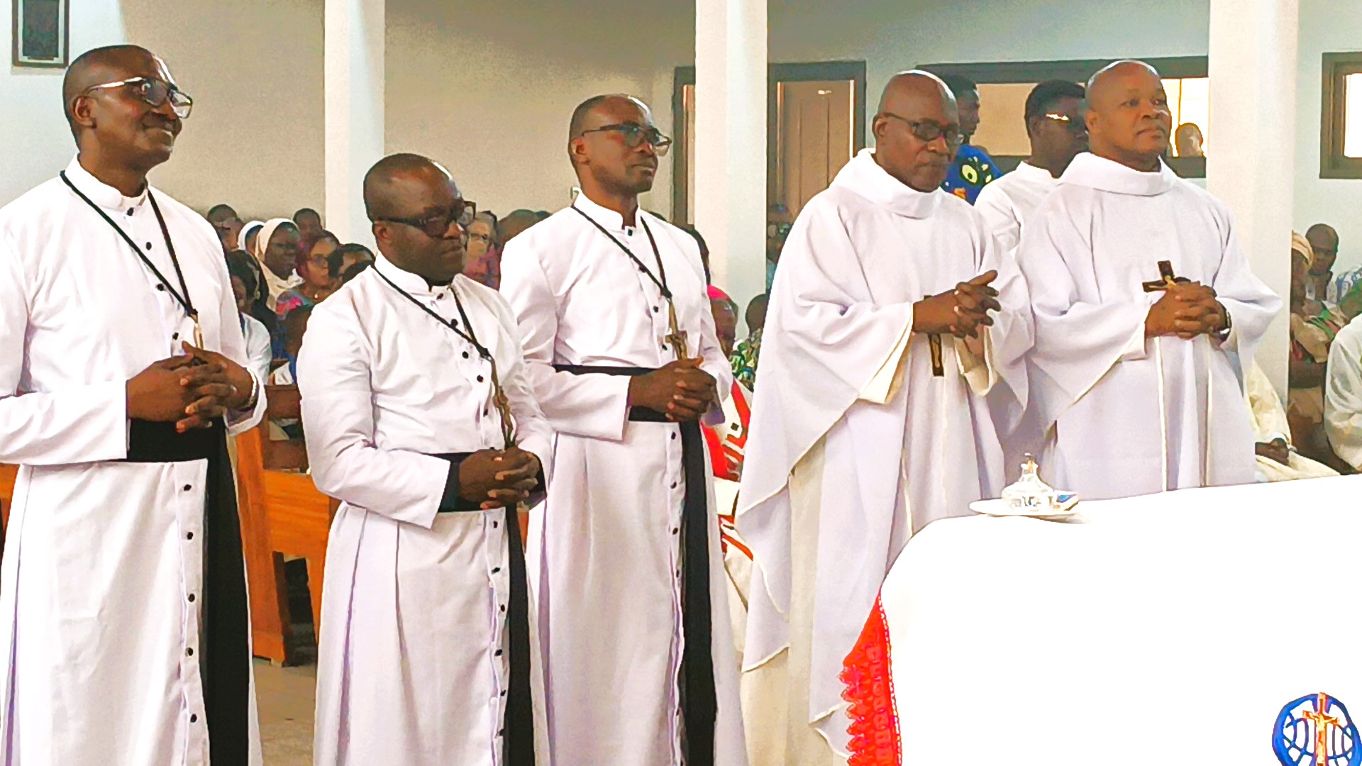 Ils sont entrés en procession après avoir changé d’habit à la fin de la messe célébrée le samedi 14 septembre dans la chapelle du scolasticat saint Eugène de Mazenod à Kinshasa-Kintambo. Ils ont laissé à la sacristie le rouge de la célébration de la Croix glorieuse. Ils ont porté le blanc de la chasuble floquée de la croix oblate pour le jubilé de l’ordination sacerdotale : Didier Mupaya et Bosco Kiabilua, ou ils ont porté la croix oblate sur leur nouvelle soutane pour le jubilé de la profession religieuse : Berthier Eyer, Frédéric Ingele et Blaise Phola.