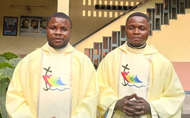 Les révérends pères Michaël Adingulu et François-Xavier Makanda, les deux plus jeunes prêtres missionnaires oblats de Marie Immaculée de la Province du Congo (RD Congo et l’Angola). Ils ont été ordonnés ce samedi 19 juillet 2025 à Kinshasa par l’archevêque de Kinshasa, le cardinal Fridolin Ambongo, dans la cathédrale Notre-Dame du Congo.